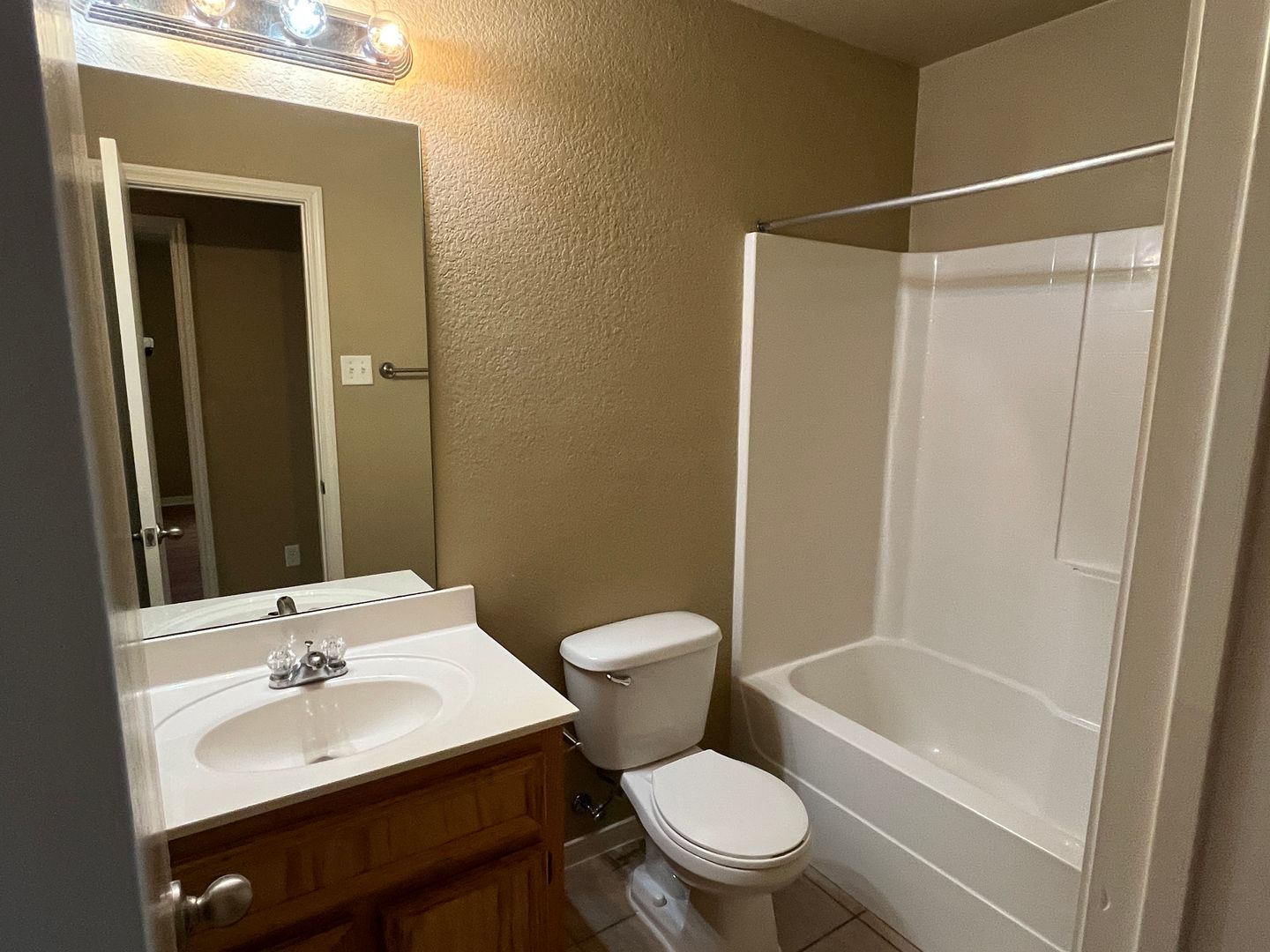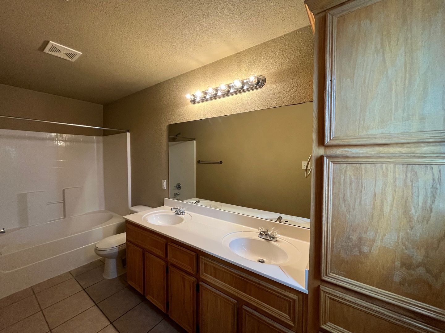 Enter into a nicely sized living area which opens into the open kitchen and large dining area. All flooring in living areas, kitchen and bathrooms is earth tone ceramic tile. Custom wood blinds, satin nickel fixtures beautiful two tone paint throughout! The kitchen is fully equipped with appliances including refrigerator, dishwasher, range and microwave. Conveniently located right around the corner of the kitchen and dining is a family computer desk – perfect for paying bills, or doing homework! The laundry room is located just off of the hallway! All three bedrooms are nicely sized with spacious closets. The master suite has its own extraordinary bath including a huge garden tub and his and her vanities! This great duplex is a must see!