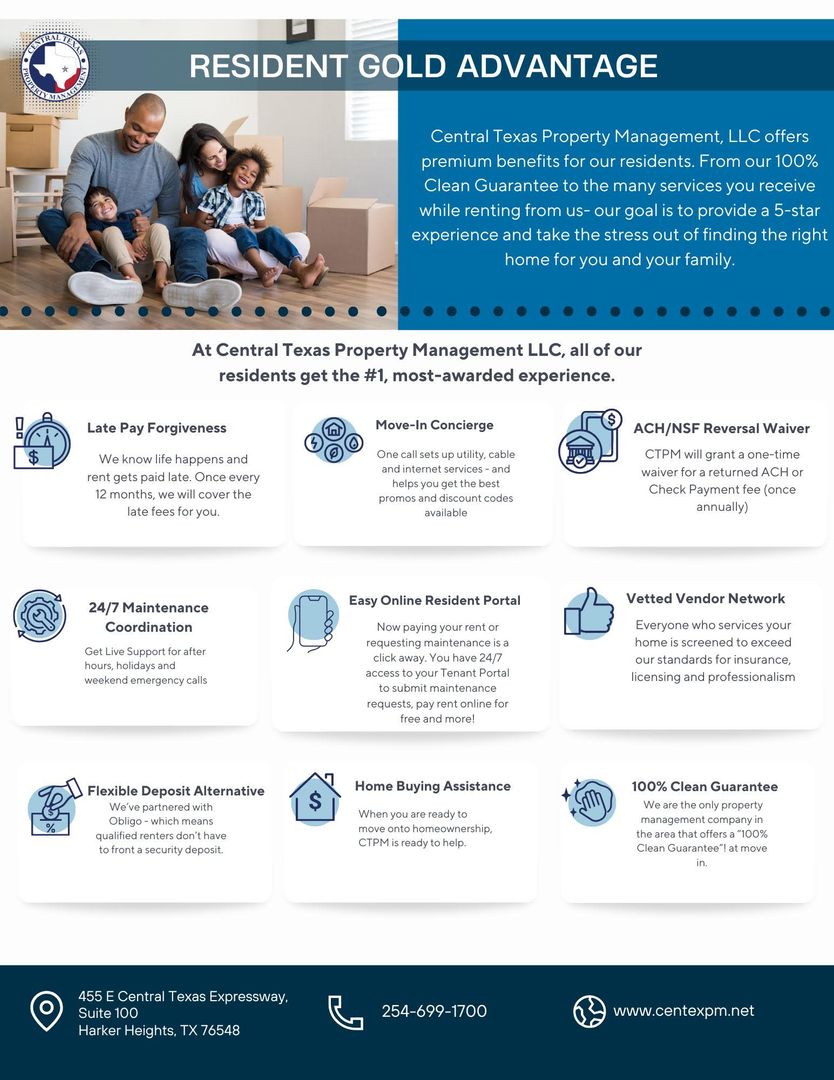 The accuracy of information, regardless of source, including but not limited to pictures, square footage, amenities, rent prices, deposits, pet policies is deemed reliable but is not guaranteed and should be independently verified through personal inspections and/or with appropriate professionals. The information provided at this site is provided solely for informational purposes and does not constitute an offer to sell, rent, or advertise real estate outside of the State in which the Owner of the site is licensed. The owner is not making any warranties or representatives concerning any of these properties including their availability. Information on this site is deemed reliable but not guaranteed. Central Texas Property Management, LLC is a real estate brokerage also operating under the name Central Texas Property Management. Central Texas Property Management, LLC, Robin Cargill Broker. 455 E. Central Texas Expressway Suite 100, Harker Heights, TX 76548.
