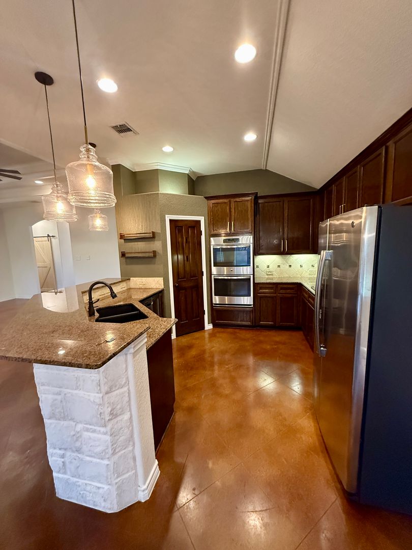 The kitchen offers plenty of room for cooking and entertaining, with granite countertops, a stone-backed breakfast bar, under-cabinet lighting, and stainless steel appliances including double built-in ovens. Cabinet space is abundant, making storage easy.
