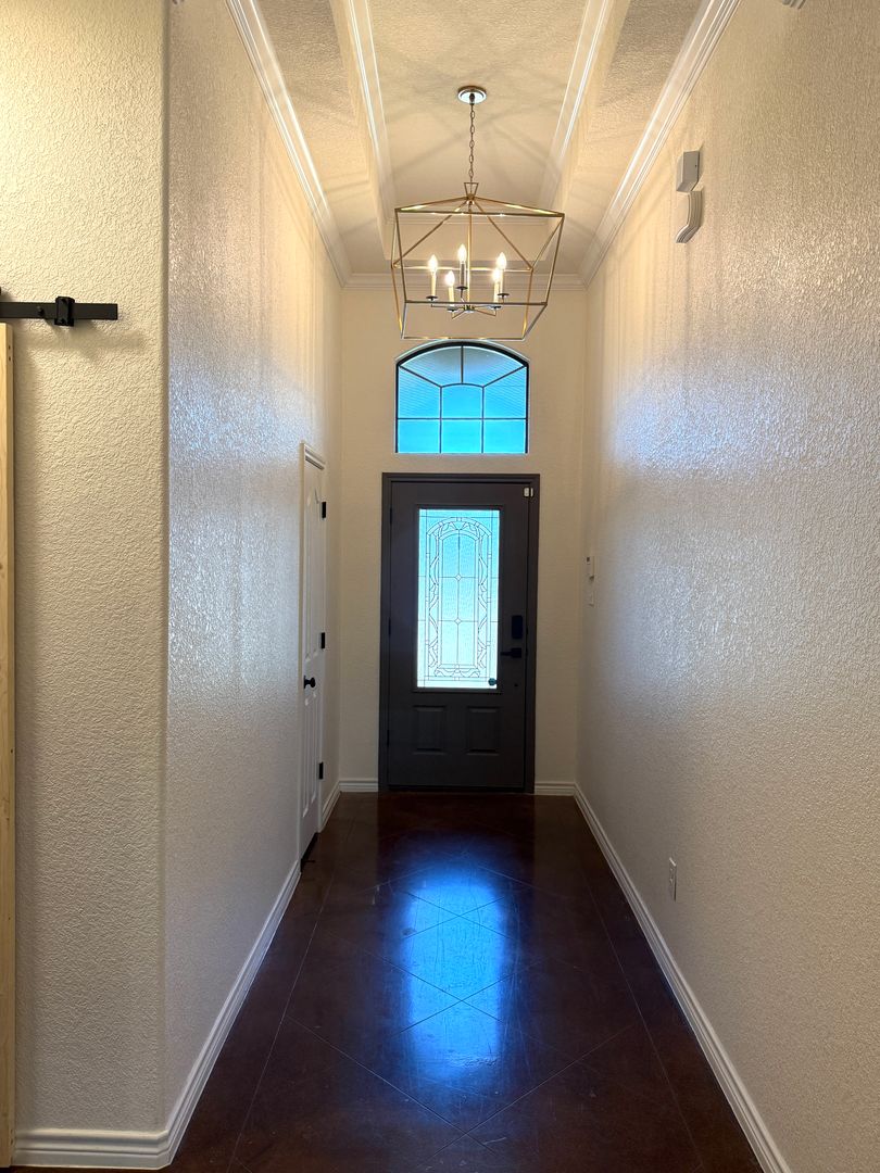 Inside, stained concrete floors run throughout the home, adding durability and low-maintenance living. The large living room features a corner stone fireplace and a double tray ceiling with crown molding detail, creating a warm and open gathering space.