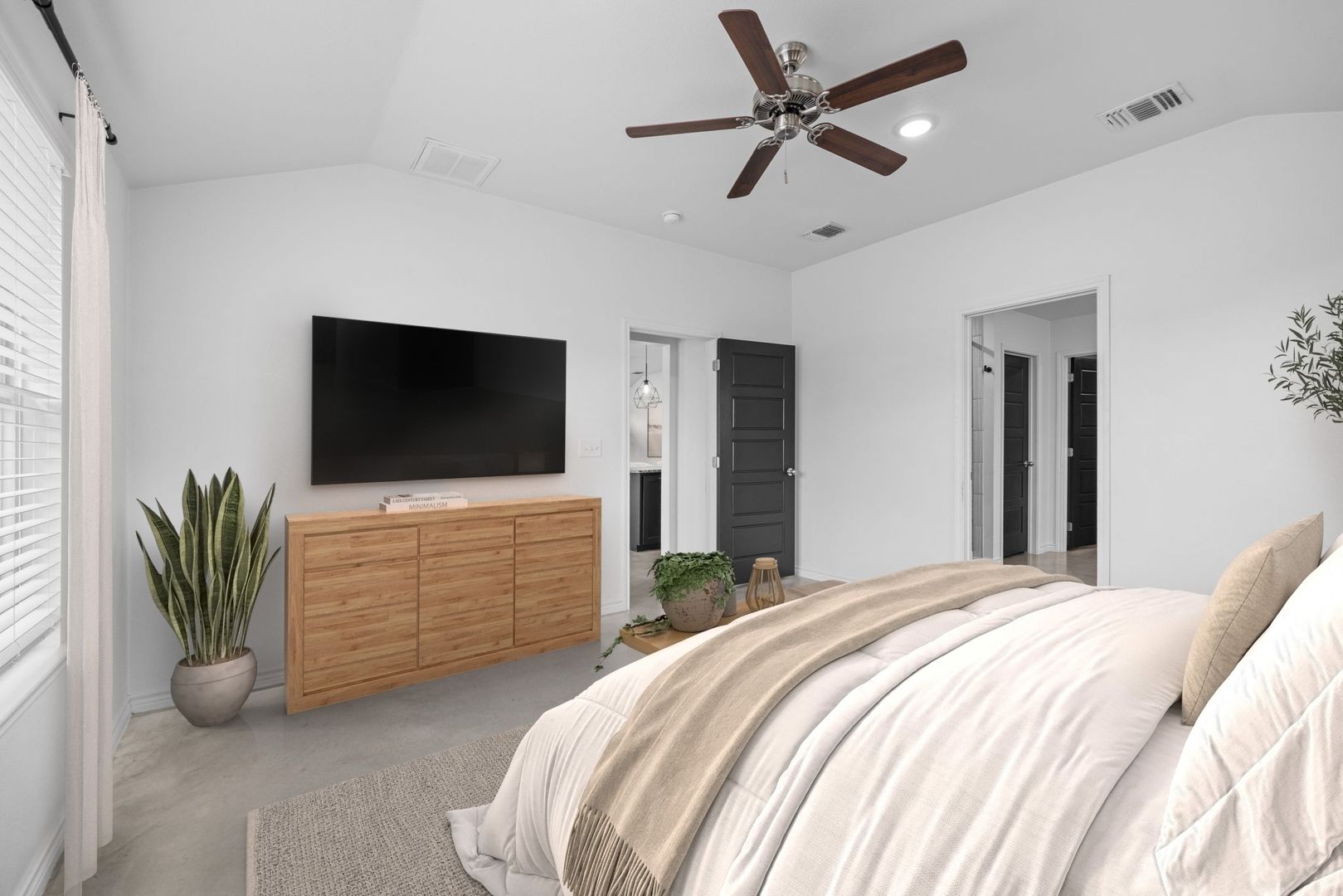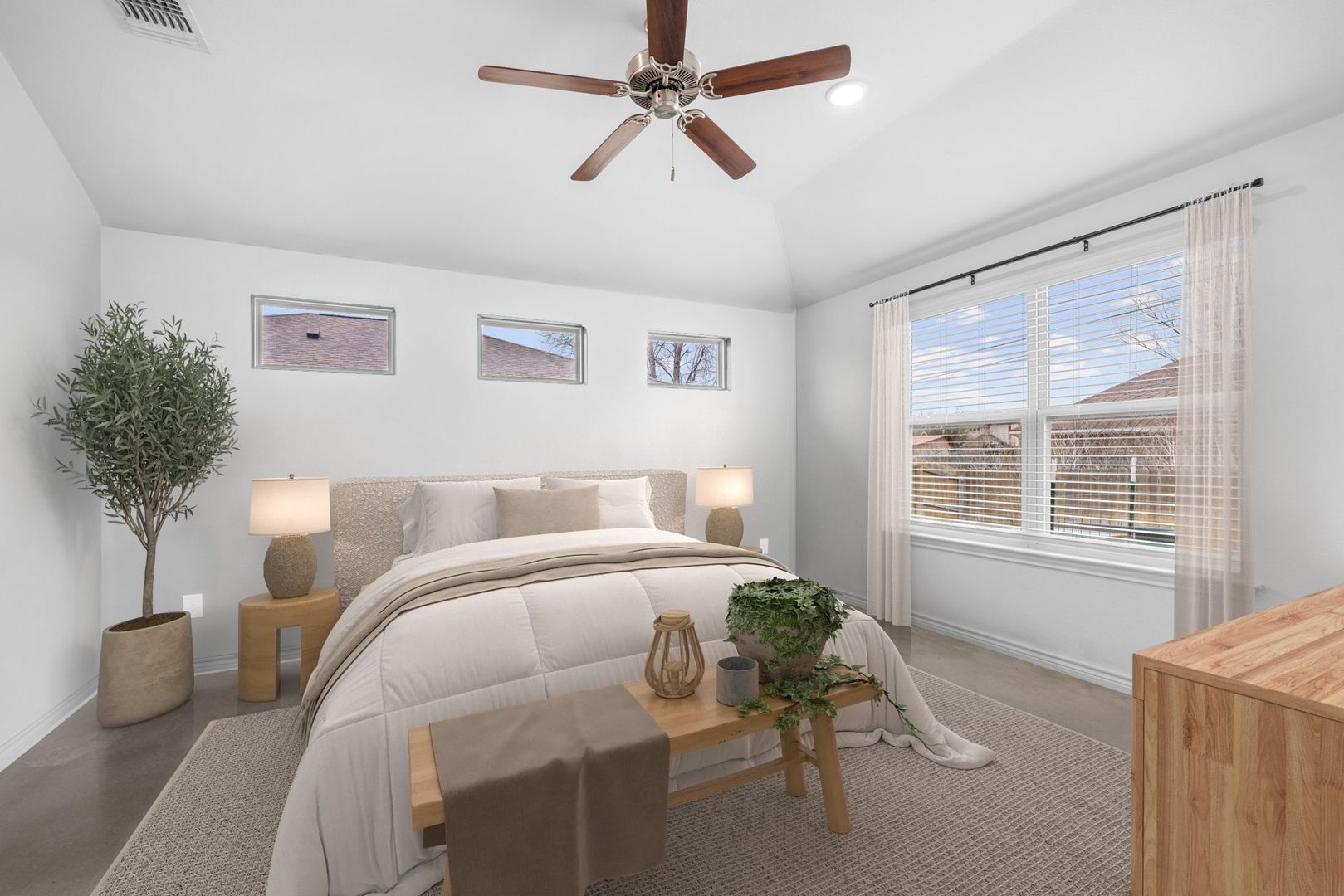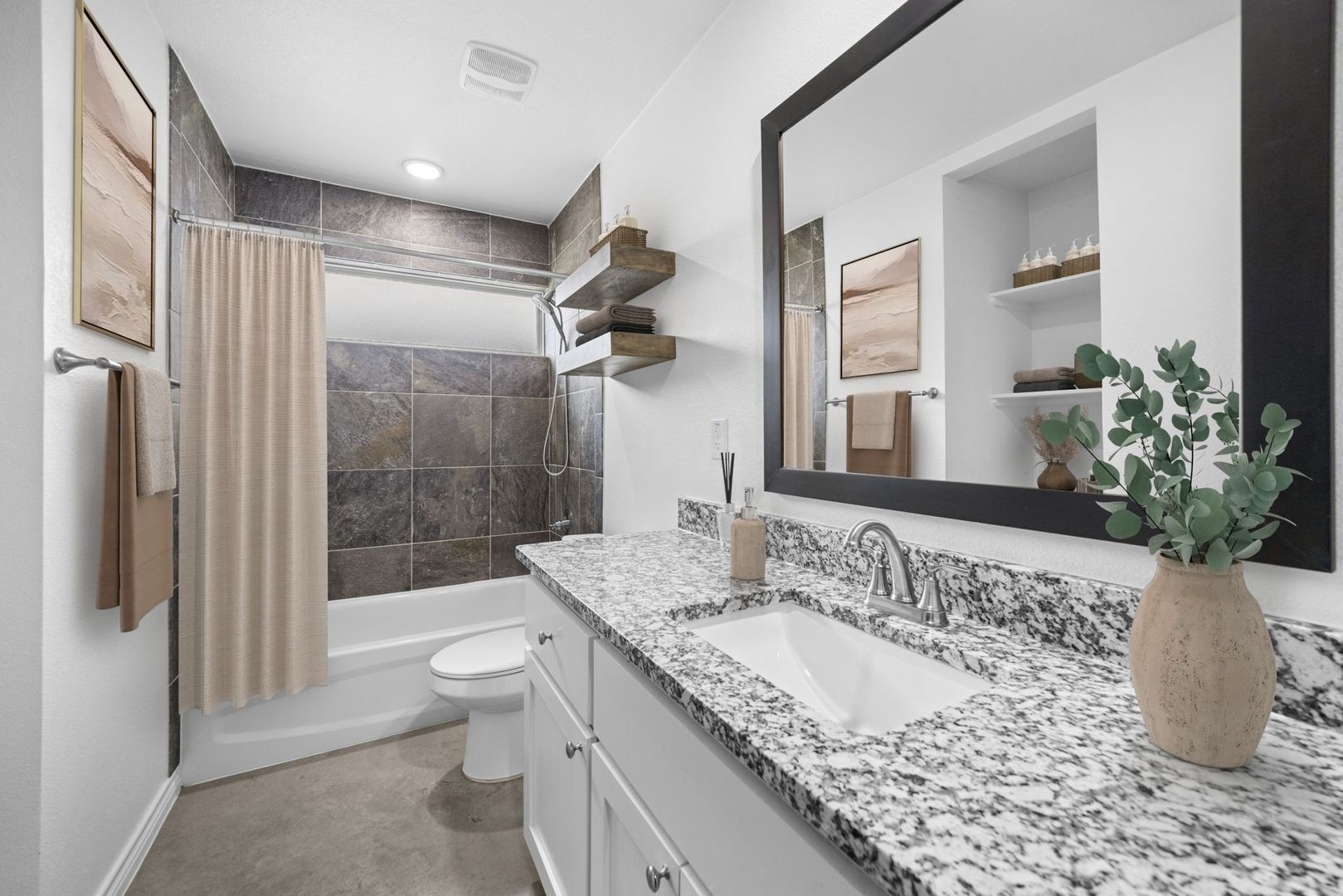 The private primary suite provides a peaceful retreat with vaulted ceilings and a spa-inspired bathroom, complete with dual granite vanities and an expansive walk-in closet with custom built-ins. The secondary bedrooms are generously sized, and the additional bathroom showcases upgraded tile work and granite finishes for a cohesive, elevated feel throughout.