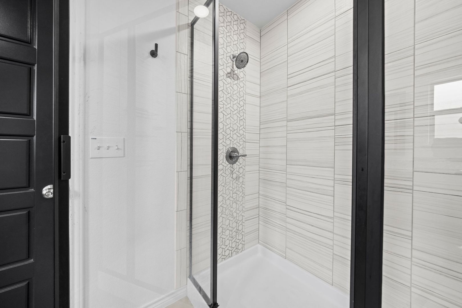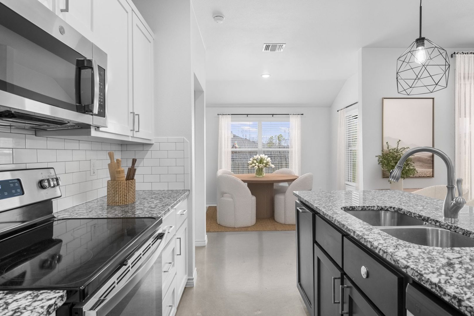 From the moment you arrive, the bold black exterior and clean architectural lines set a sophisticated tone. Inside, the home features soaring ceilings, polished concrete floors, and abundant natural light that create a modern, welcoming atmosphere. The kitchen serves as the heart of the home, offering crisp black and white cabinetry, granite countertops, stainless steel appliances, and an oversized island with designer lighting that flows seamlessly into the open living space.