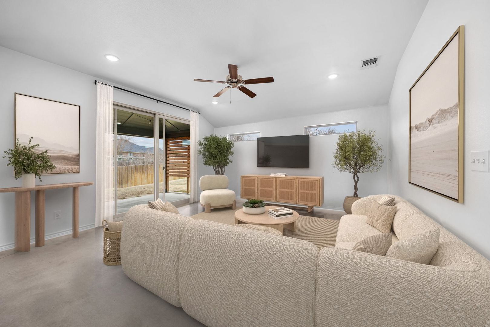 The exterior includes a covered back patio with custom privacy slat detailing, overlooking a fully fenced backyard suitable for relaxation or entertaining.